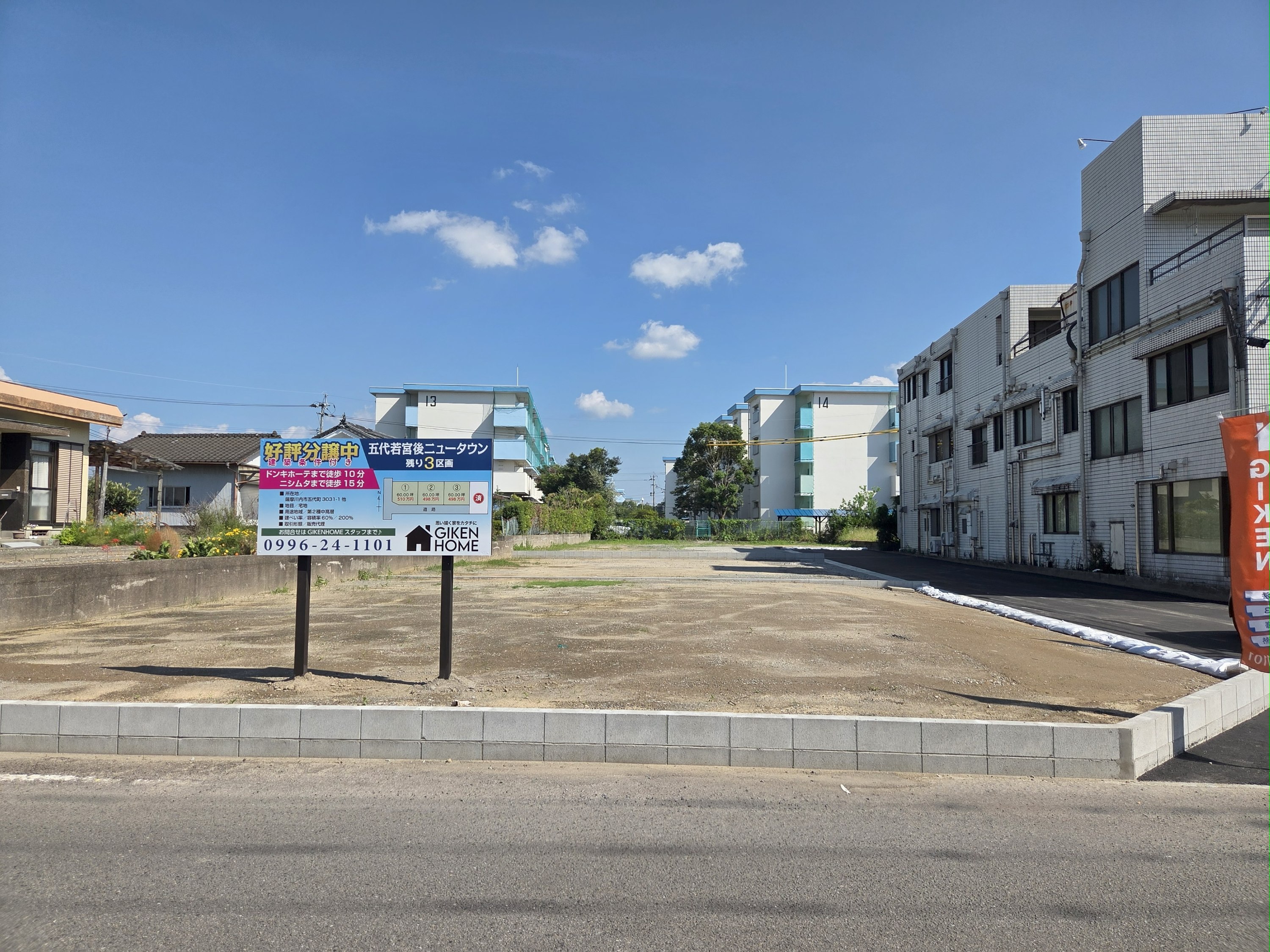 所在地:薩摩川内市五代町若宮後3031-1他 五代団地横 建築条件付き! ①60.02坪 510万円 ②60.03坪 498万円 ③60.00坪 498万円 ④ご成約
